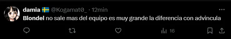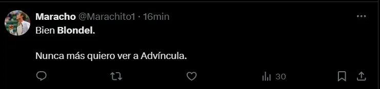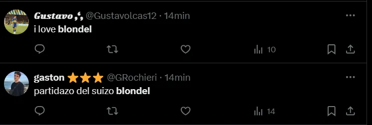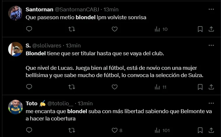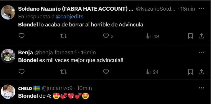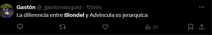 “Blondel no sale más del equipo es muy grande la diferencia con Advíncula”, “Blondel tiene que ser titular hasta que se vaya del club”, “Que partidazo de Blondel”, “I love Blondel”, “La diferencia entre Blondel y Advíncula es jerárquica”, “Blondel es mil veces más que Advíncula”, fueron algunos de los comentarios de los hinchas de Boca bancando al lateral.