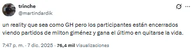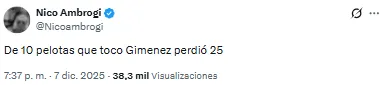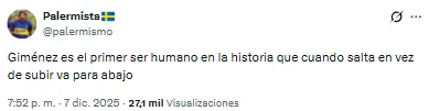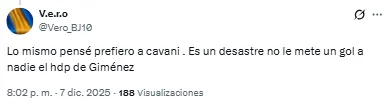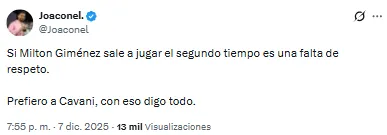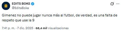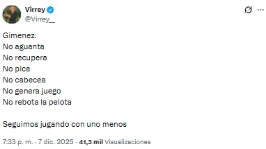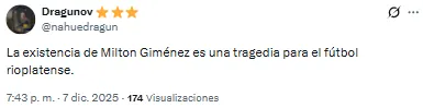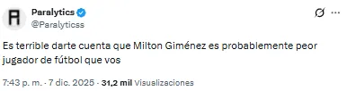 “La existencia de Milton Giménez es una tragedia para el fútbol rioplatense”, destacó uno de los usuarios en X. Otro, en cambio, fue más contundente: “Es terrible darte cuenta que Milton Giménez es probablemente peor jugador de fútbol que vos”.
