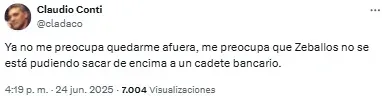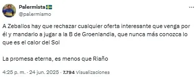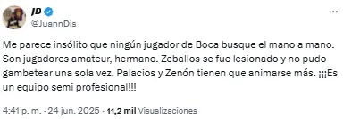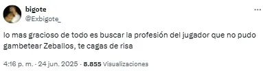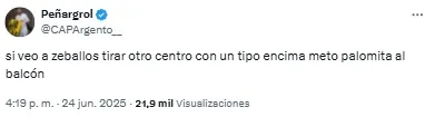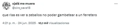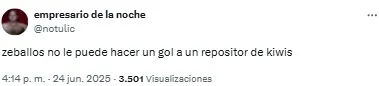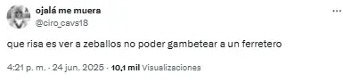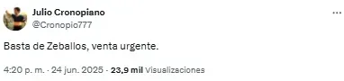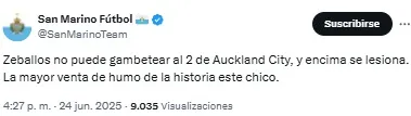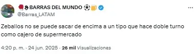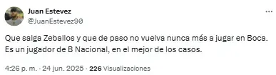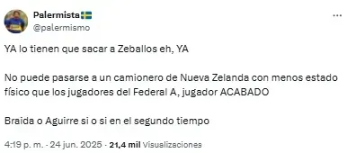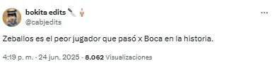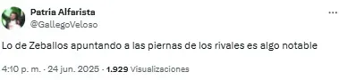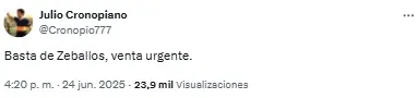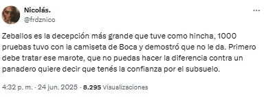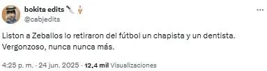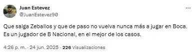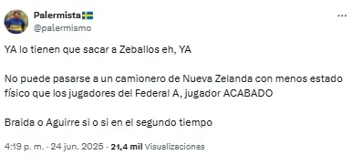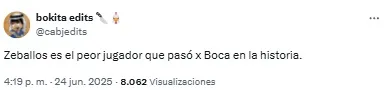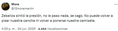 “Listo. A Zeballos lo retiraron del fútbol un chapista y un dentista. Vergonzoso, nunca, nunca más”, compartió uno de los usuarios. Mientras que otro sintetizó: “Basta de Zeballos. Venta urgente”.