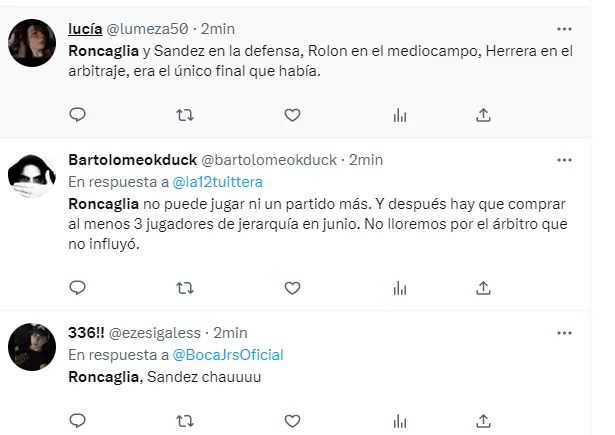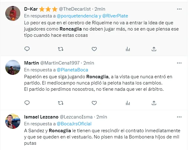 Debido a su rendimiento, algunos hinchas afirman que Roncaglia “da lástima”, mientras que otros piden que no juegue más con la camiseta de Boca y le recriminan a Juan Román Riquelme por haberlo incorporado al plantel tras quedar libre de Chipre.