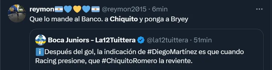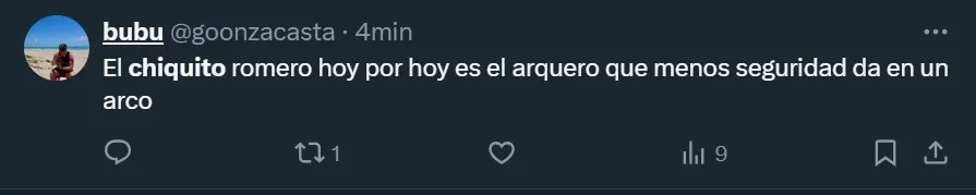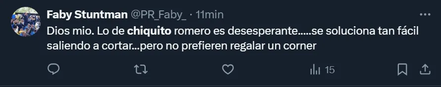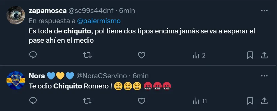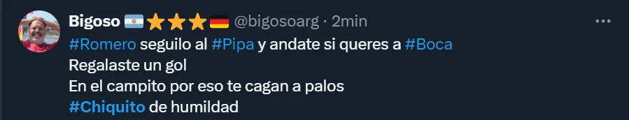Así como hubo muchos comentarios solicitando que ocupe un lugar entre los suplentes y le den la titularidad a Leandro Brey, también fueron varios los simpatizantes xeneizes que pidieron por la partida del ex arquero de la Selección Argentina, e incluso existieron comentarios mostrándole todo su enojo: “Te odio Chiquito Romero”, exclamó el usuario de X @NoraCServino. Hasta algunos hinchas sostuvieron que el misionero ‘jugó para Racing‘ por su pasado en el club de Avellaneda.