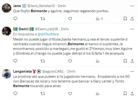 Debido a este mal resultado que obtuvo el equipo dirigido por Diego Martínez, los hinchas del Xeneize se mostraron inconformes en las redes sociales, donde criticaron el rendimiento de algunos futbolistas, y uno de los principales apuntados fue uno de los refuerzos, como lo es Tomás Belmonte.