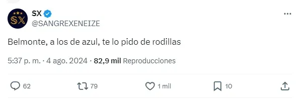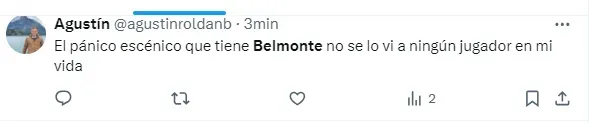 “¿A Belmonte le da vértigo pasarla para adelante o que?”, “Belmonte flojo”, “Belmonte es horrible”, “Que flojito Belmonte”, “Belmonte no es más que Campuzano”, “Belmonte, a los de azul, te lo pido de rodillas”, fueron algunos de los comentarios de los hinchas criticando al volante.