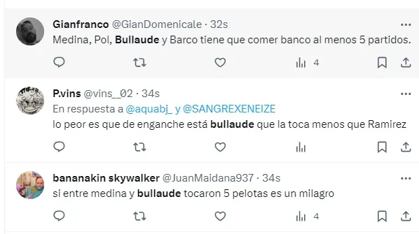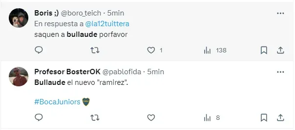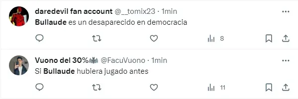 “Bullaude en 20 minutos no la tocó”, “Ya van 20 minutos y no me había dado cuenta de que bullaude estaba jugando! Es una planta”, “Bullaude el nuevo “ramirez””, “saquen a bullaude por favor”, fueron algunos de los tantos comentarios de los usuarios xeneizes en Twitter criticando al futbolista.