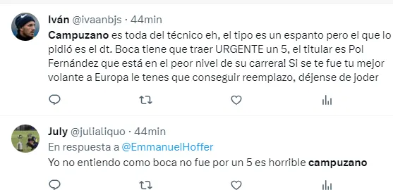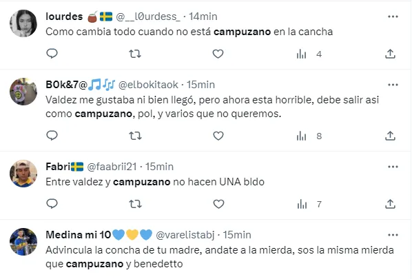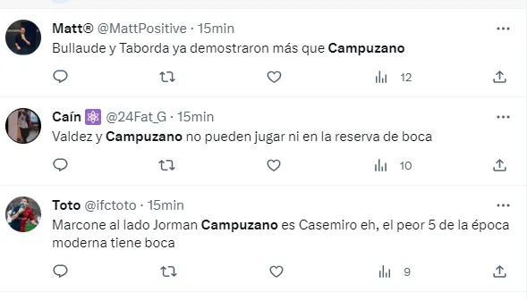 “Campuzano es toda del técnico eh, el tipo es un espanto pero el que lo pidió es el dt”, “Campuzano sos un burro”, “Como cambia todo cuando no está Campuzano en la cancha”, fueron algunas de las tantas críticas de los hinchas en las redes.