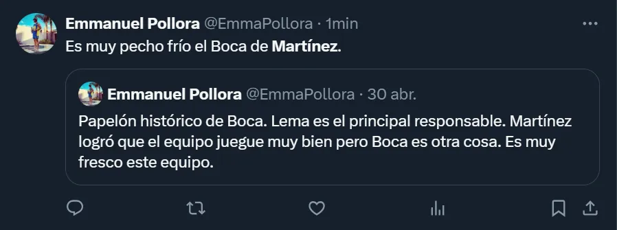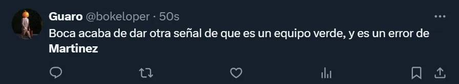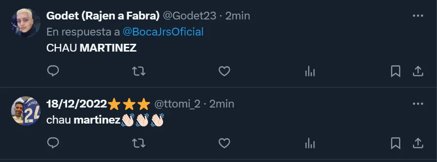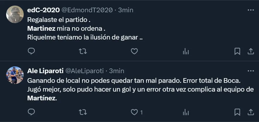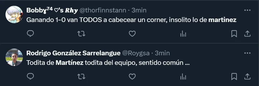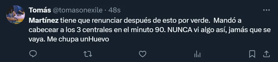 “Martínez tiene que renunciar después de esto por verde. Mandó a cabecear a los 3 centrales en el minuto 90. Nunca vi algo así, jamás. Que se vaya”, escribió el usuario @tomasonexile, uno de los tantos simpatizantes boquenses por lo que aconteció en La Bombonera. También en Twitter hubo más comentarios, donde @godet23 y @ttomi_2 coincidieron: “Chau Martínez”, enfatizaron.