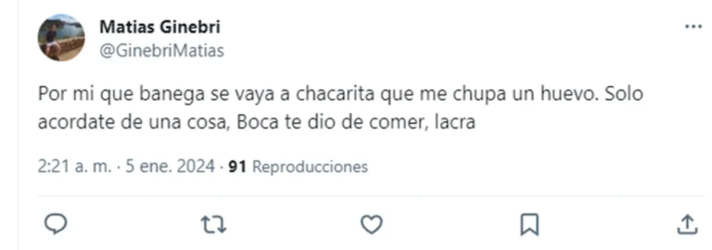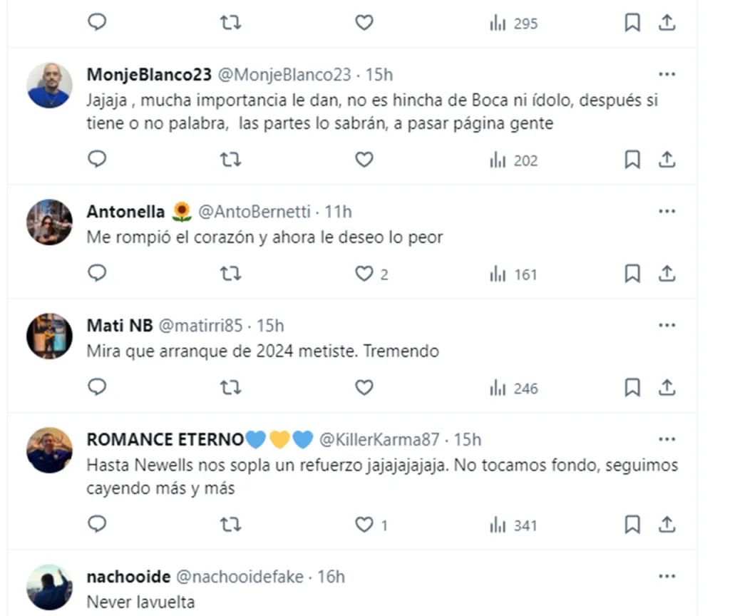 “Por mí que Banega se vaya a Chacarita. Me chupa un huev*. Solo acordate de una cosa: Boca te dio de comer, lacra”, le recriminó un hincha. “Román, Tevez, Gago… Son un caso aparte. Suerte, Banega. Gracias por no venir”, expresó otro. “Banega necesitaba promocionarse. Usó la camiseta de Boca y se fue a Newell’s. Tan sencillo como eso”, destacó uno más.