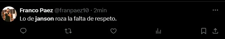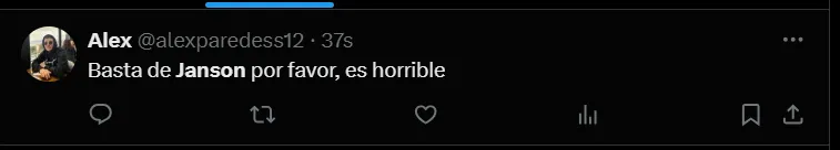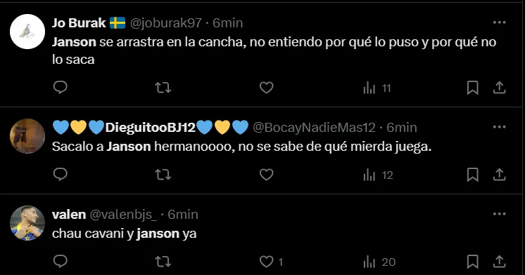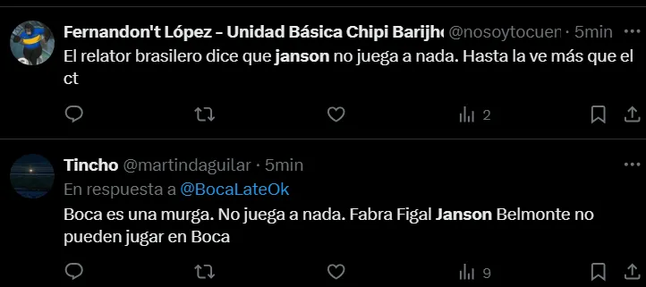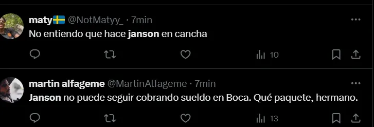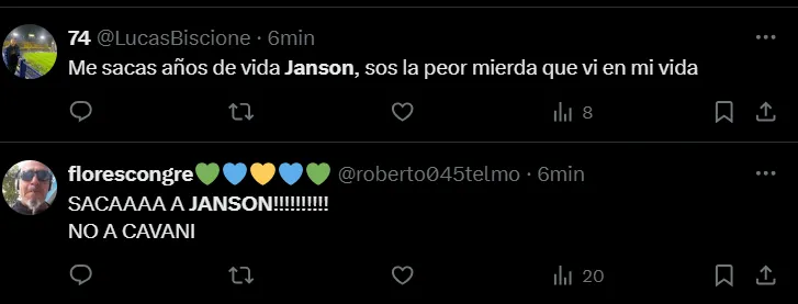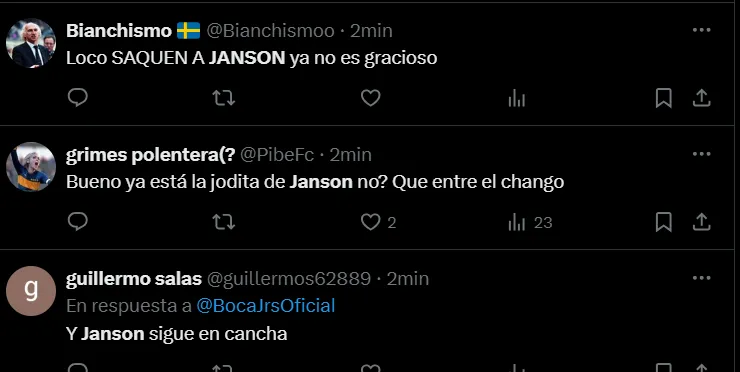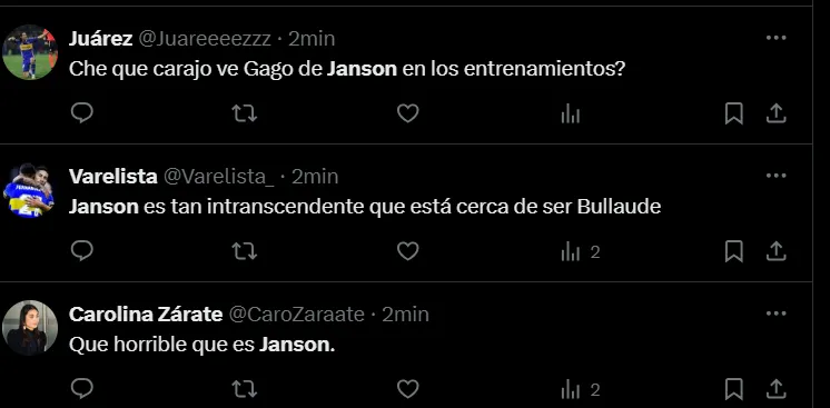 “No es posible que Janson siga en Boca”, “Janson no tiene una virtud”, “Janson tendría que haber salido”, “Hace un año demostró que no puede jugar en Boca”, “¿Cómo llegó Janson a Boca?”, “Janson es horrible”, “Que Janson juegue los 90 minutos es un chiste”, fueron algunos de los comentarios de los hinchas criticando el partido del ex Vélez.