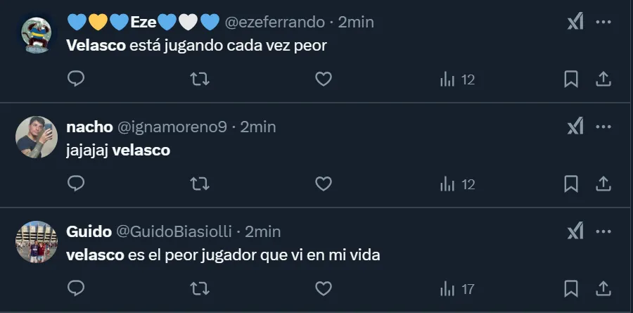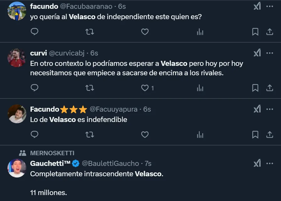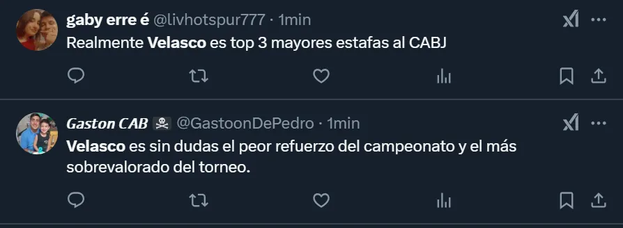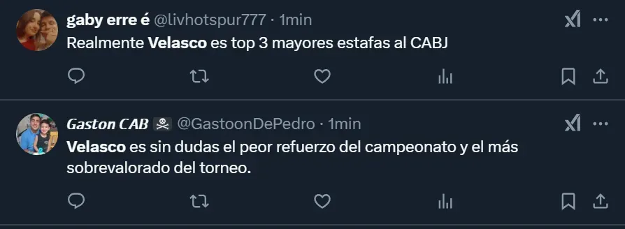“Realmente, Velasco es top 3 de las mayores estafas al CABJ”, expresó en Twitter el usuario @livhotspur777, uno de los tantos hinchas del club de La Ribera que se mostró indignado por el nivel del enganche de 22 años nacido en la ciudad de Berazategui. Lo cierto es que el futbolista disputó 62 minutos hasta que fue reemplazado por Brian Aguirre, y no logró rematar al arco rival, como así tampoco pudo generar peligro con pases filtrados.