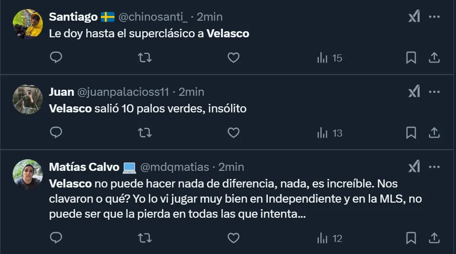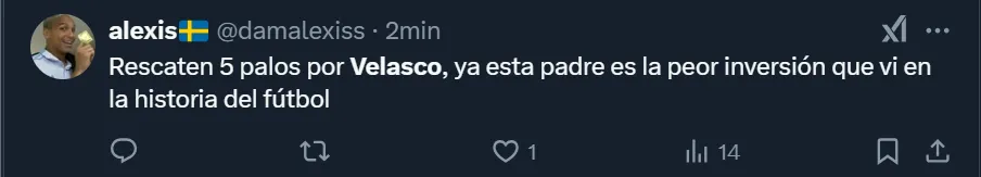 Así como ocurrió en el último partido frente a Independiente Rivadavia y también antes frente a Racing, las críticas cayeron en Alan Velasco. Muchos de los simpatizantes se muestran enojados por su desempeño, del que sostienen que es completamente diferente al que se vio en Independiente y también en Dallas FC, pero hay otros que la queja la instalan por lo que abonó la institución: 10 millones de dólares.