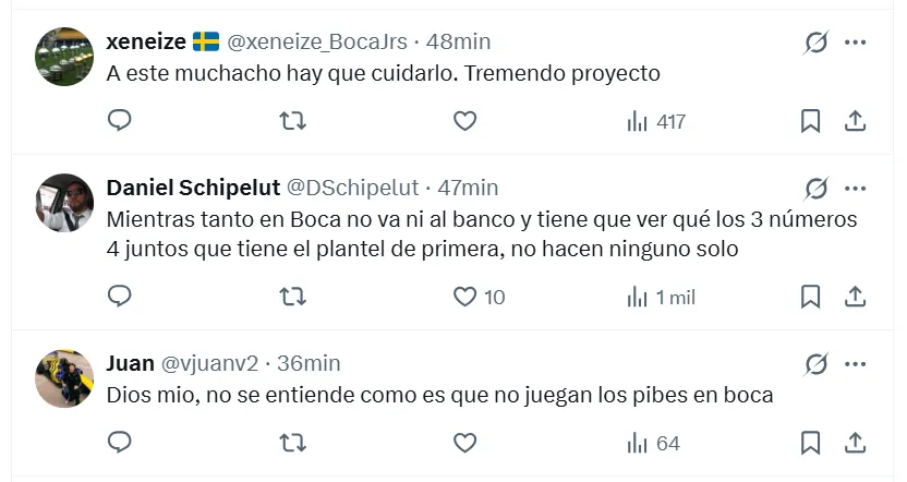 El prometedor juvenil recibió la pelota a pocos metros del área de Italia y no dudó: encaró, gambeteó 4 rivales, tiró un caño y definió con frialdad ante la salida del arquero europeo. Sin exagerar, convirtió un golazo. Pero claro, no pasó desapercibido en las principales plataformas por los hinchas de Boca, que se quejaron por los pocos minutos que tiene en Primera División.