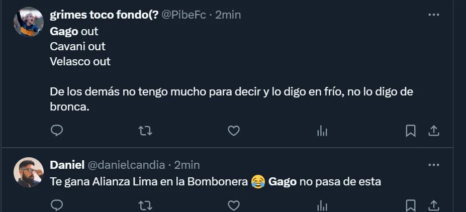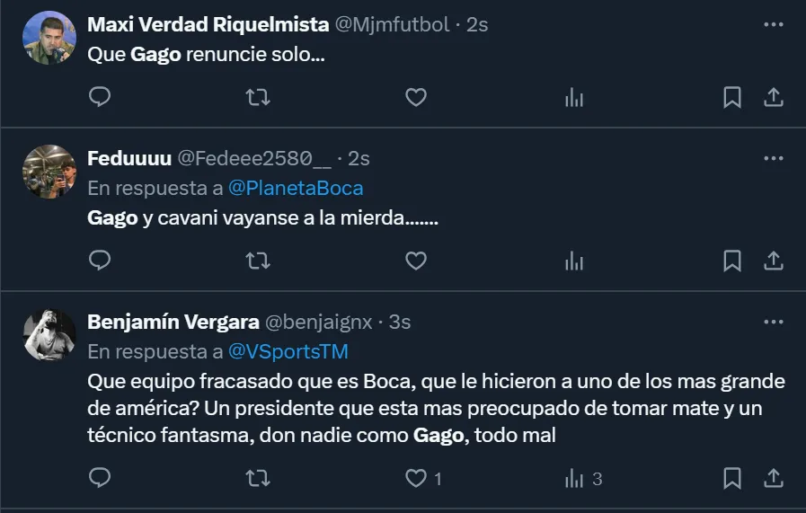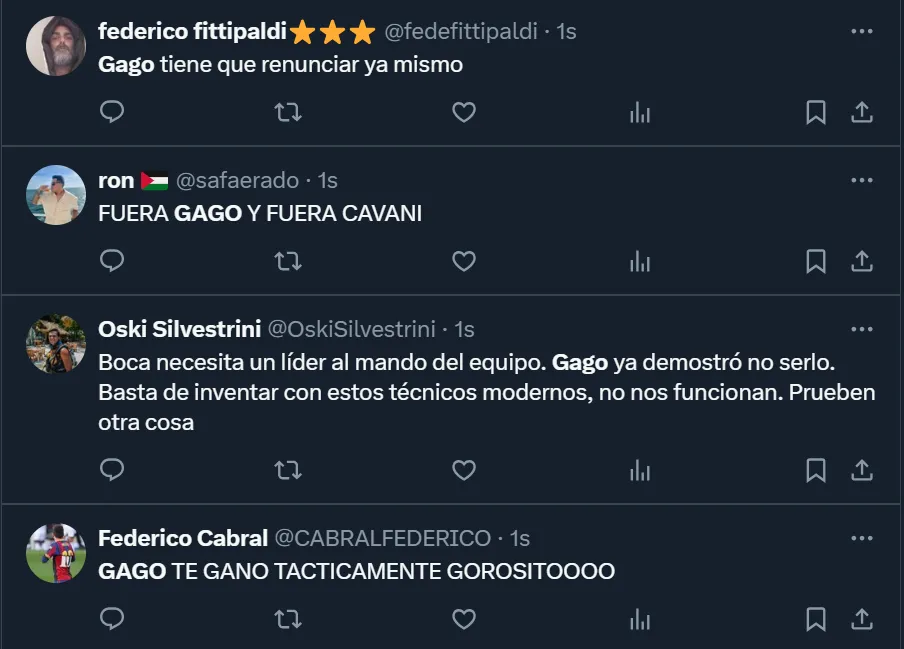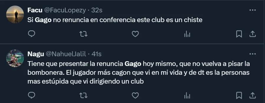 “Andate Gago, ciclo terminado”; “Gago tiene que renunciar ya mismo”; “Fuera Gago y fuera Cavani”; “Que Gago renuncie solo”, y “Si Gago no renuncia en conferencia, este club es un chiste”, fueron varios de los comentarios que se observaron a través de X (ex Twitter), donde el entrenador con pasado en Aldosivi, Racing y Chivas de Guadalajara se transformó en tendencia a nivel nacional.