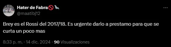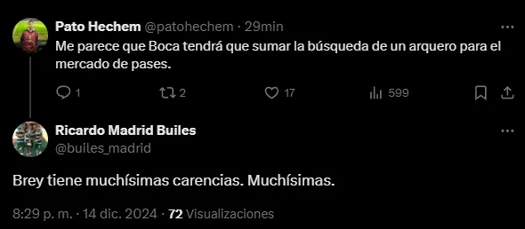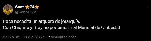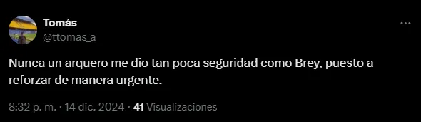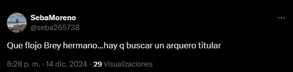 Por eso, hubo miles de comentarios en X (Twitter) criticando a Brey apuntando contra su “poca seguridad“, “sus carencias” y su “falta de jerarquía“. Ante esto, los hinchas del club de la Ribera piden un nuevo arquero a la dirigencia. “Puesto a reforzar de manera urgente“, ha llegado a decir un fanático.