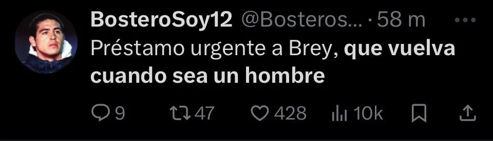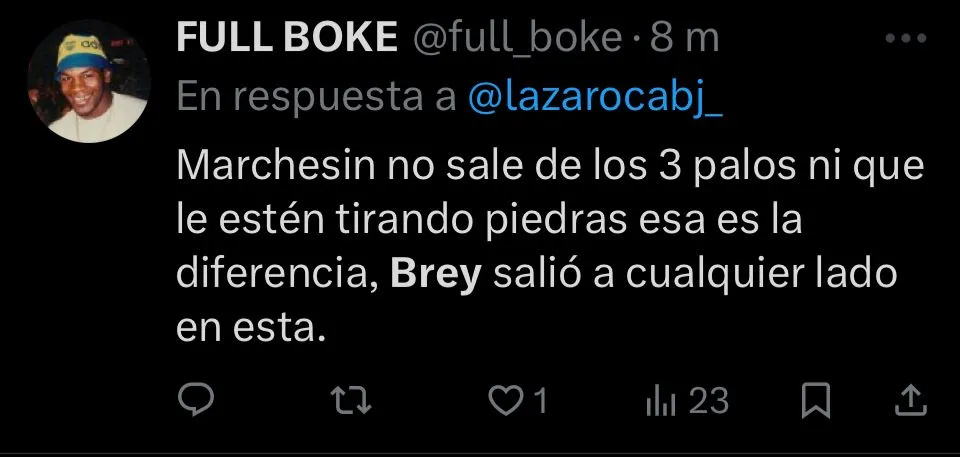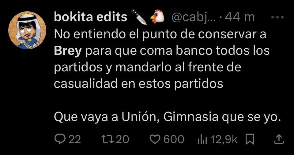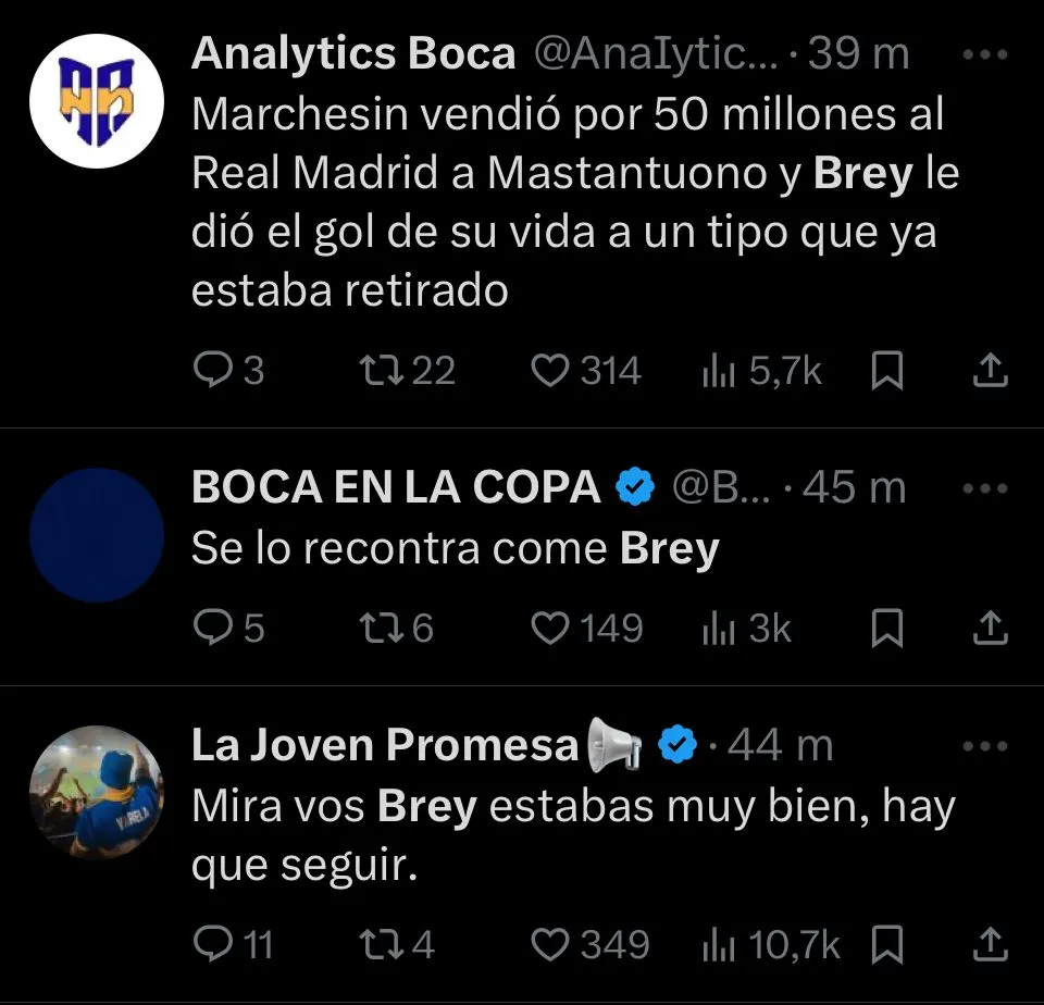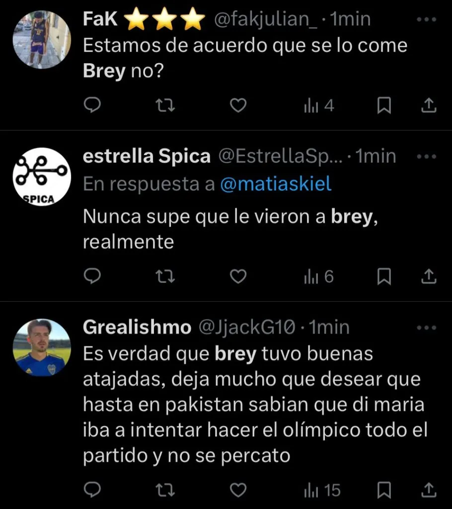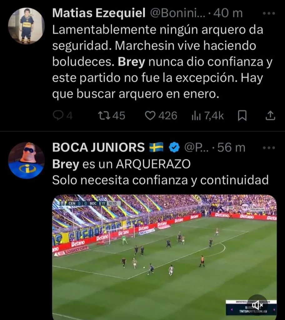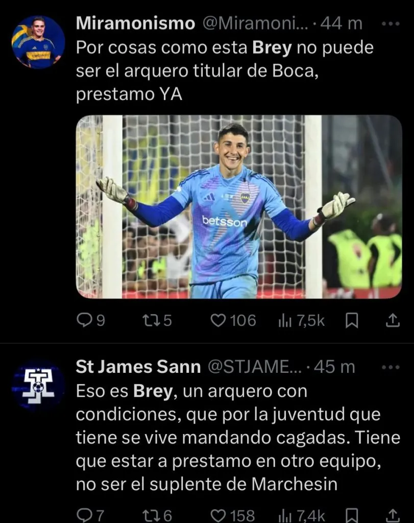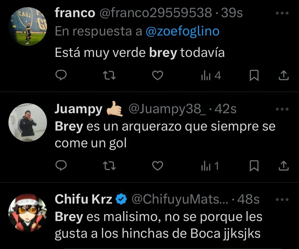 “Nunca supe que le vieron a Brey, realmente“, expresó el usuario @EstrellaSpica, desaprobando sin ningún filtro al guardameta. “Es un arquerazo que siempre se come un gol“, agrega @Juampy38_. En cambio, otros, como @stjamessann, priorizaron opinar sobre el juvenil pensando a futuro. “Es un arquero con condiciones, que por la juventud que tiene se vive mandando cagadas. Tiene que estar a préstamo en otro equipo“, escribió.