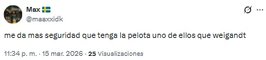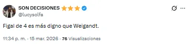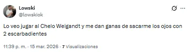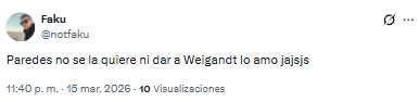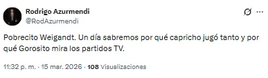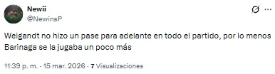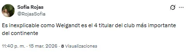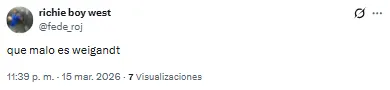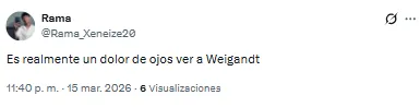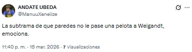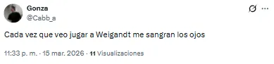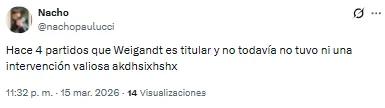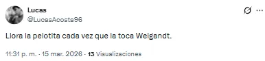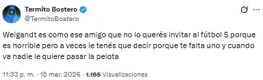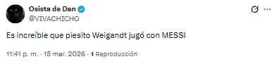 El futbolista proveniente de Inter Miami recibió una catarata de críticas por su función en aquel lado del campo. “Llora la pelotita cada vez que la toca Weigandt”, lanzó uno de los hinchas. Otro, en cambio, disparó: “Es increíble que Weigandt haya jugado con Messi”.