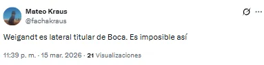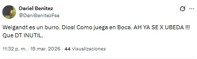 En ese contexto, los hinchas de Boca se manifestaron en redes sociales contra el rendimiento del equipo, pero especialmente contra la actuación de Marcelo Weigandt, nuevamente titular como lateral derecho.