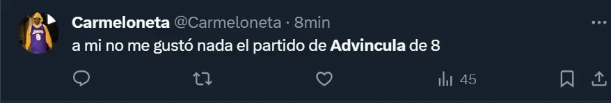 Para darle lugar a Lucas Blondel, el DT de Boca decidió que Advíncula formara parte de la línea de mediocampistas, algo que supo hacer en su paso por Newell’s, como así también jugó más adelantado en el ciclo que condujo Jorge Almirón. Sin embargo, la actuación del peruano dejó mucho que desear, y los simpatizantes xeneizes lo hicieron notar.