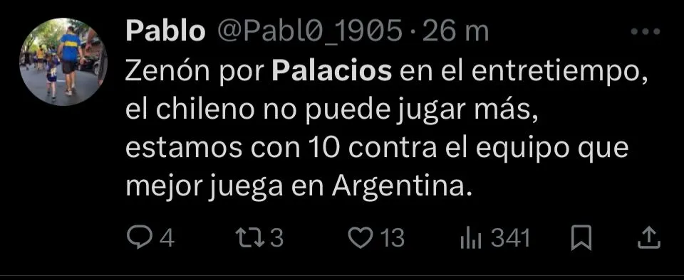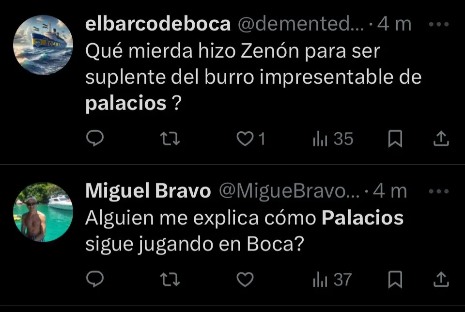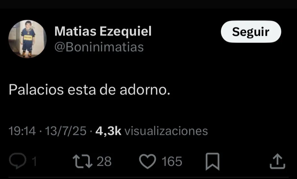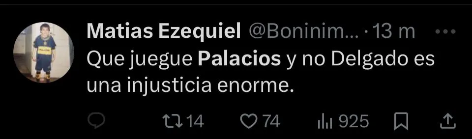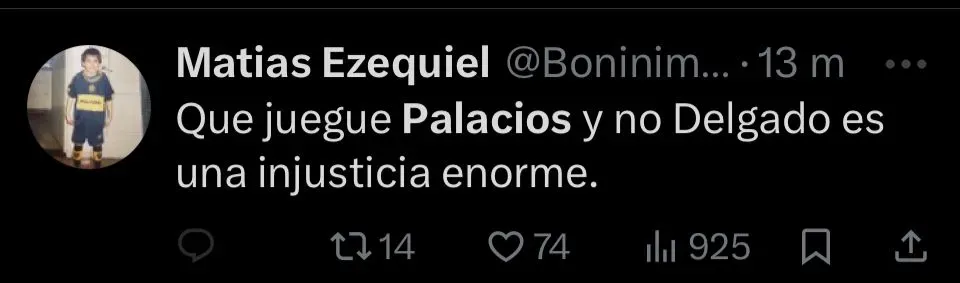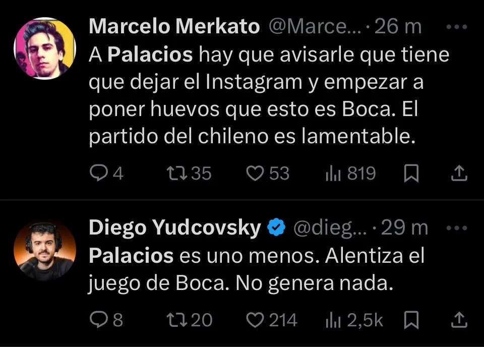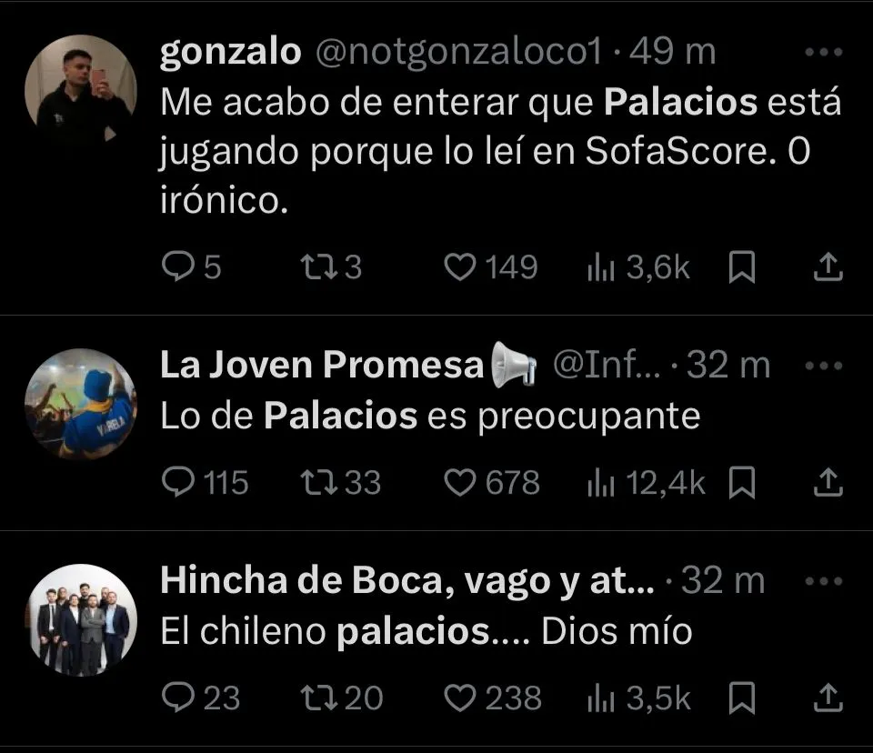 Otros fueron aún más tajantes. “Palacios no puede jugar nunca más en Boca, realmente horrible”, publicó @Paler. Así, el rendimiento de Palacios fue uno de los principales puntos de crítica tras el encuentro. Y en redes sociales, la sentencia general fue contundente.