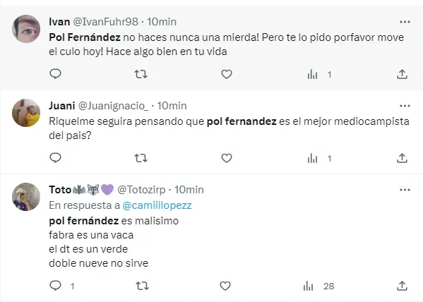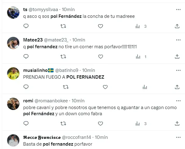 “Lo de Pol Fernández es lamentable”, “Pol Fernández es malísimo”, “Basta de Pol Fernández porfavor”, “Pol Fernández no puede jugar ni en la B nacional”, fueron algunos de los tantos comentarios en contra del jugador del Xeneize.