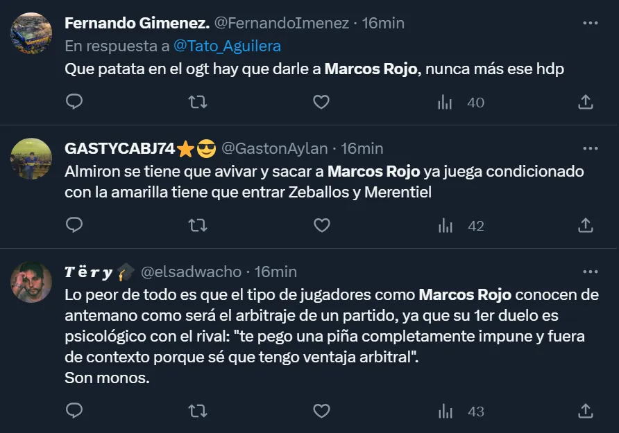 Por medio de las redes sociales, principalmente en Twitter, el ex Manchester United fue despotricado por más de un simpatizante que pidió su salida. “Qué patada en el oje** hay que darle a Marcos Rojo. Nunca más ese hijo de pu**”, expresó el usuario @FernandoImenez. Otro de los duros comentarios estuvo enfocado en que el zaguero no conoce el reglamento: “Lo peor de todo es que el tipo de jugadores como Marcos Rojo conocen de antemano como será el arbitraje de un partido”, destacaron en la red social del pajarito.