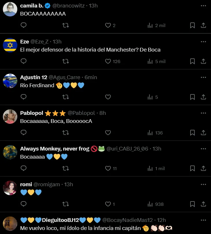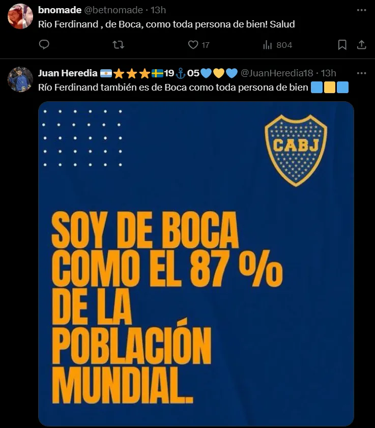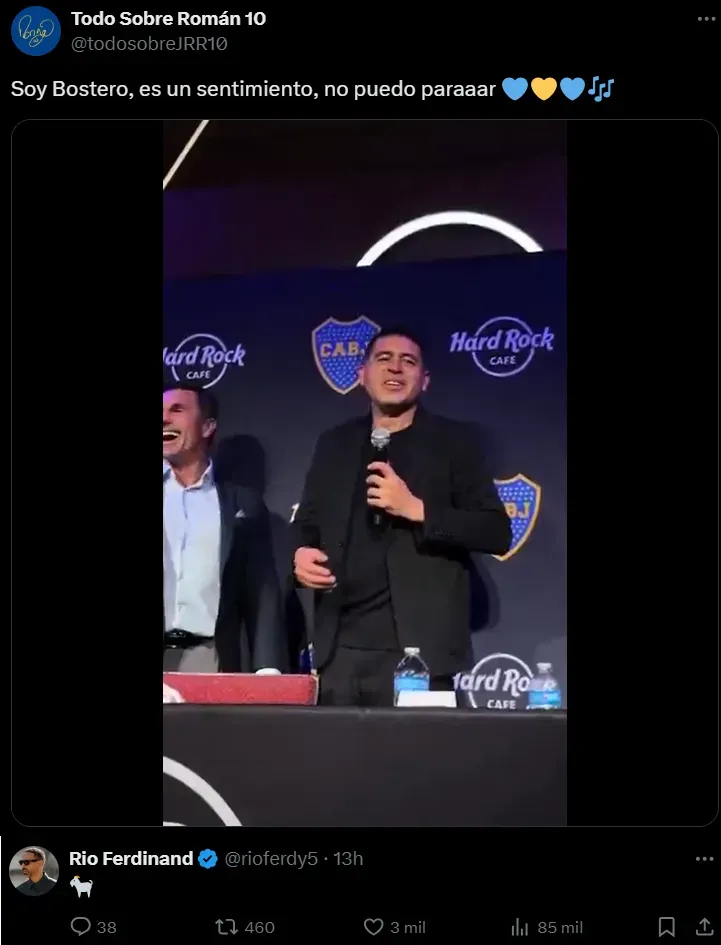 En dicho evento, el presidente del Xeneize agarró el micrófono y cantó junto a los hinchas: “Soy Bostero, es un sentimiento, no puedo parar”, entonó Román, mientras los presentes deliraban junto a él. En la era de las redes sociales, el video de Riquelme se hizo viral rápidamente y trascendió fronteras, a tal punto que el propio Rio Ferdinand lo comentó en su cuenta de X. Cabe destacar que fueron contemporáneos a lo largo de sus grandes carreras deportivas.