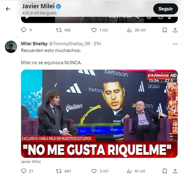 Los me gusta de Milei en contra de Juan Román Riquelme