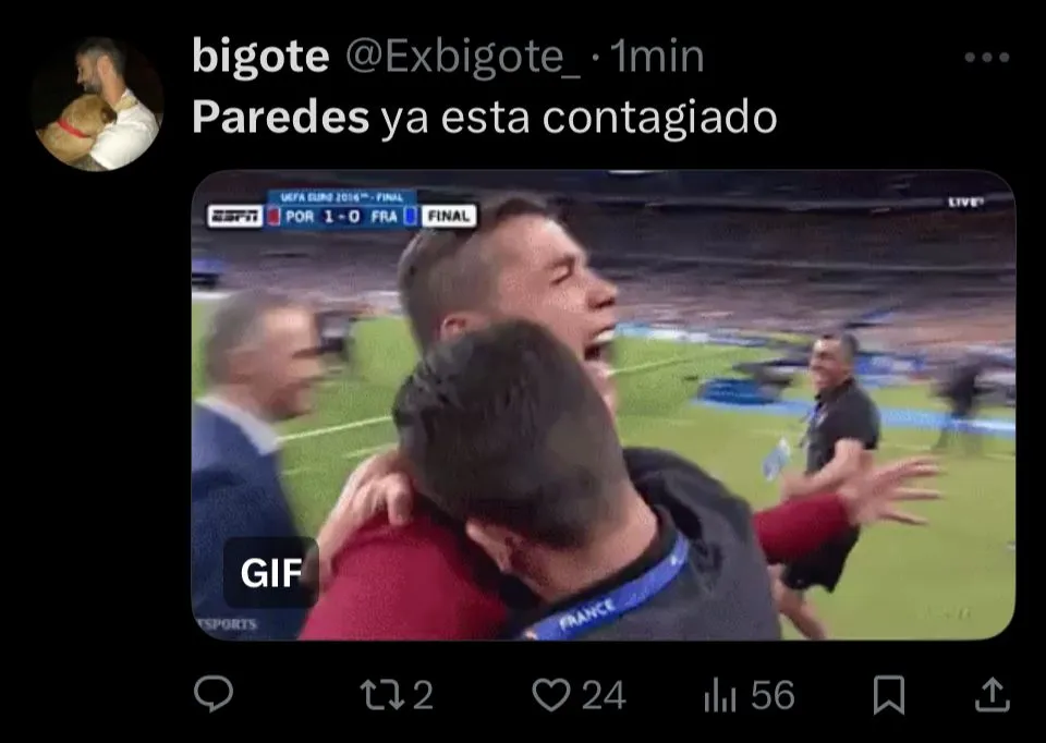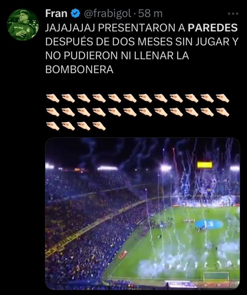 En un partido con altibajos, tensión en las tribunas y un rendimiento colectivo flojo, Paredes ingresó a los 20 minutos del segundo tiempo en reemplazo de Carlos Palacios. Lo hizo justo en el saque del medio tras el gol de Cristian Tarragona, que había adelantado al Tatengue. Un detalle que causó reacciones y que los meses explotaran: por el contexto, por la expectativa de su regreso y, claro, por el folclore que sacaron a relucir usuarios hinchas River.