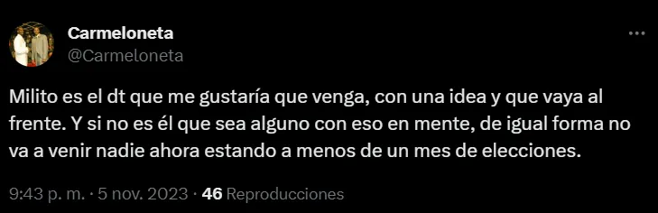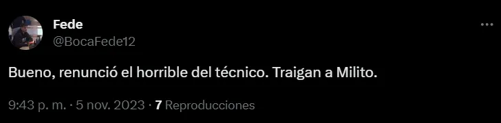 Por intermedio de las redes sociales, los hinchas de Boca comenzaron a pronunciarse con respecto al reemplazante de Jorge Almirón. Y lo cierto es que muchos de los fanáticos Xeneizes se inclinaron por la figura de Gabriel Milito, alguien que diagramó un interesante trabajo en Argentinos Juniors y que ahora se encuentra libre.