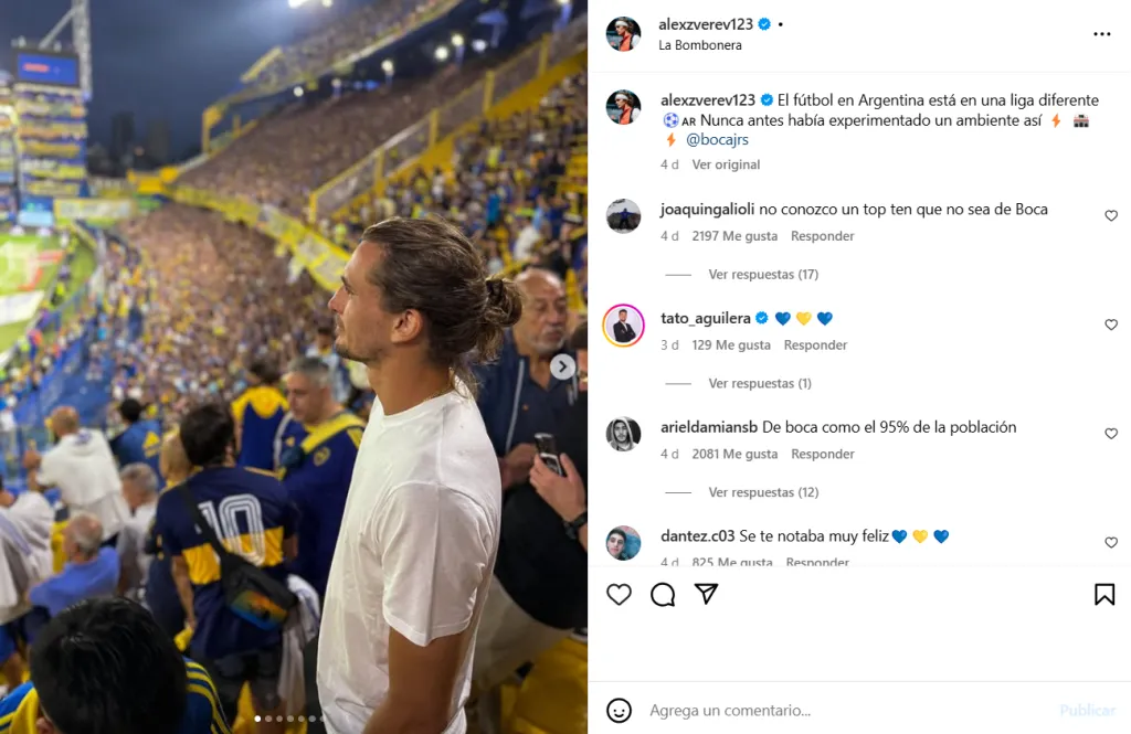 Antes de tener su debut en el Argentina Open 2025, Zverev tuvo tiempo para ir a ver a Boca en La Bombonera. El pasado martes, los de Fernando Gago se vieron las caras con Independiente Rivadavia de Mendoza en La Bombonera por la quinta fecha de la Zona A del Torneo Apertura y el número 2 del mundo dijo presente en el estadio. De hecho, compartió imágenes en sus redes sociales y se lo notó feliz de estar allí.
