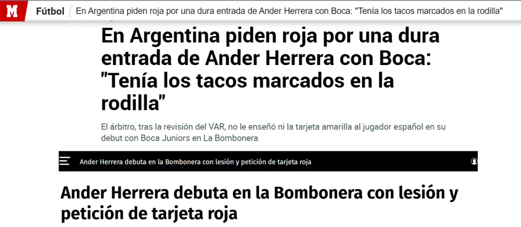 Por otro lado, el diario Marca publicó: ”En Argentina piden roja por una dura entrada de Ander Herrera con Boca: ‘Tenía los tacos marcados en la rodilla”’. Además, resaltó que ”no fue sancionado ni con tarjeta amarilla por el colegiado Hernán Mastrángelo”.