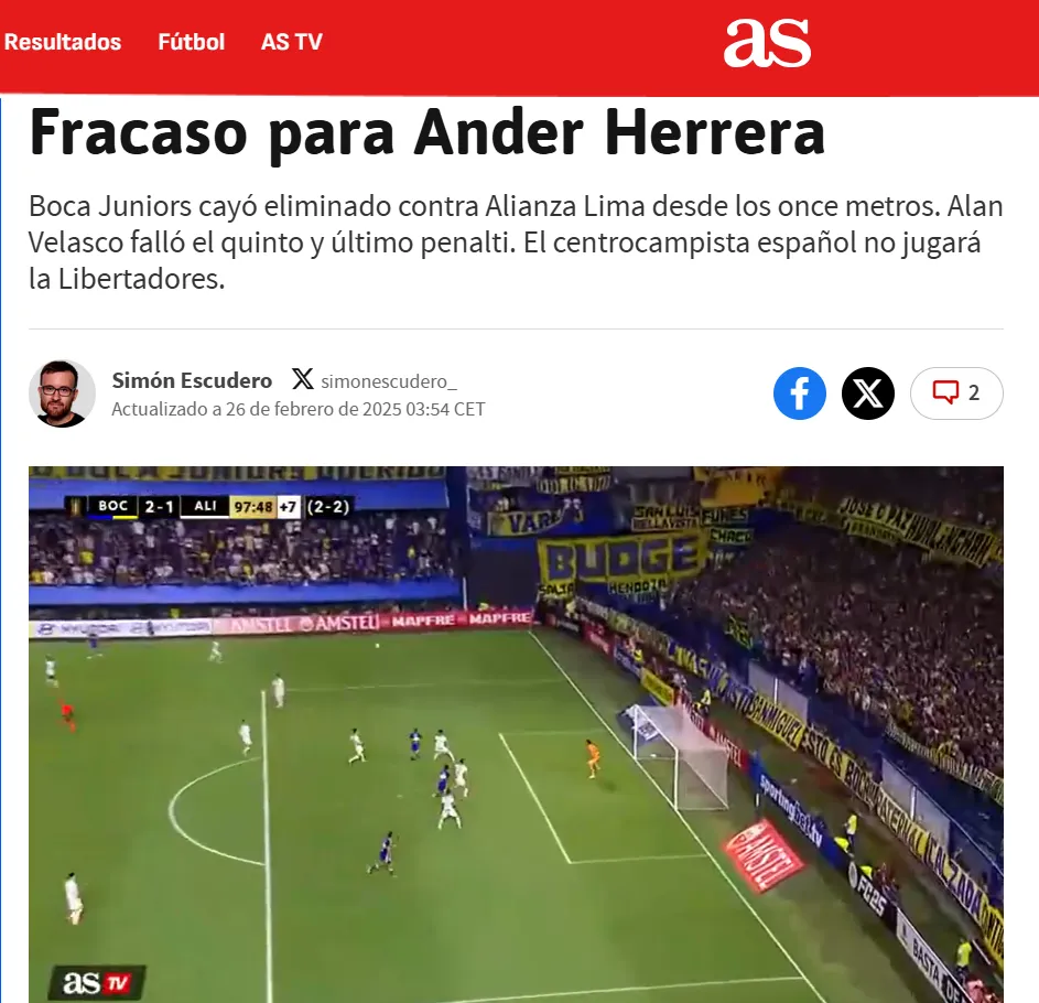Boca se quedó afuera de la Copa Libertadores en la Fase 2 al caer por penales en la Bombonera ante Alianza Lima, noticia que tuvo repercusión mundial. Sobre todo en España, en donde este miércoles 26 de febrero amanecieron con la novedad de que Ander Herrera deberá esperar, por lo menos, hasta el 2027 para cumplir con su deseo de experimentar a fondo la competencia continental (ni siquiera llegó a viajar a la capital peruana para el encuentro de ida).