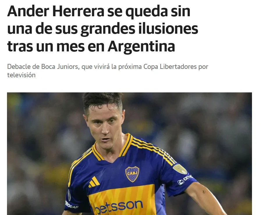 Por su parte, El Correo, medio de comunicación de Bilbao, también resaltó el resultado imprevisto para el club que preside Juan Román Riquelme: ”Ander Herrera se queda sin una de sus grandes ilusiones tras un mes en Argentina”. Y remató: ”Debacle de Boca Juniors, que vivirá la próxima Copa Libertadores por televisión”.