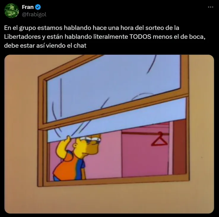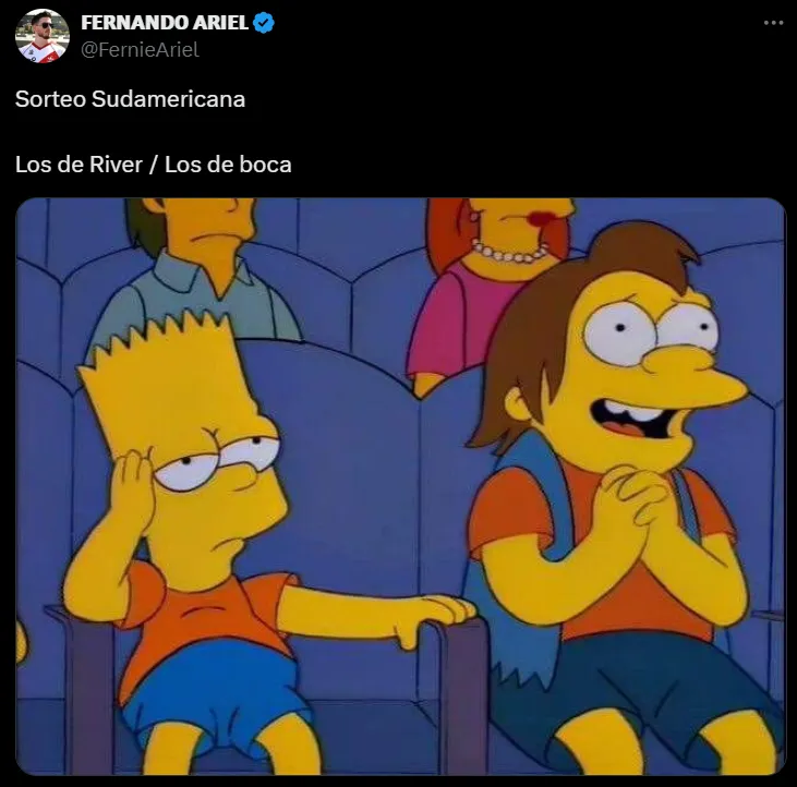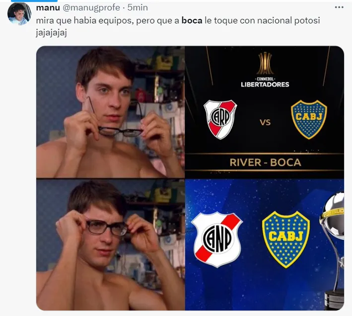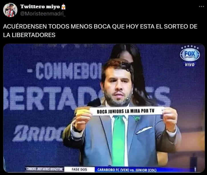Es que los usuarios de la mencionada red social no perdieron el tiempo. Hinchas de Boca pero también ajenos se manifestaron con publicaciones muy divertidas sobre el sorteo de la Copa Sudamericana. Bajo esa órbita, las burlas por el hecho de que el Xeneize no esté en la Copa Libertadores fueron quienes se adueñaron principalmente del show.