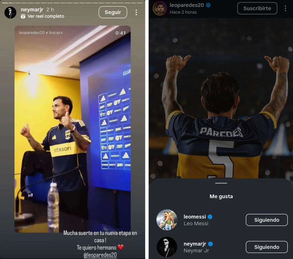 “¡Mucha suerte en tu nueva etapa en casa! Te quiero, hermano“, compartió el crack del Santos en sus historias de Instagram, adjuntando el video de la presentación de Paredes en la sala de prensa del Alberto J. Armando. Por su parte, Messi se despachó con un me gusta a una publicación de Leandro.