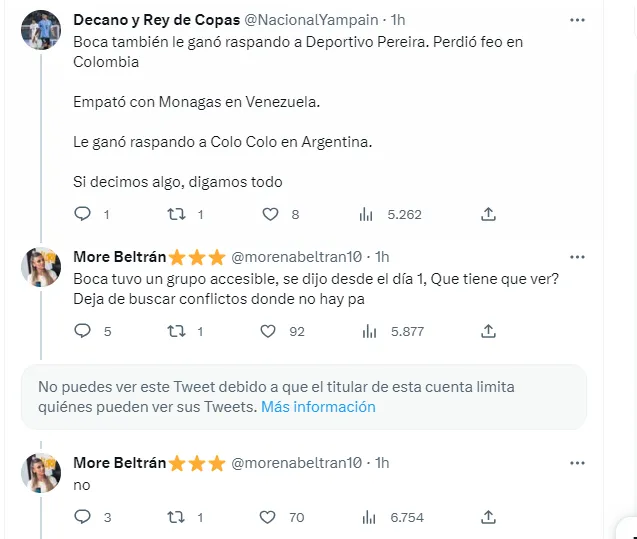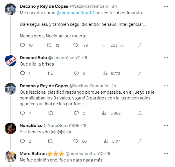 A un hincha del equipo uruguayo este comentario no le gustó, y la citó en Twitter, diciendo: “Me encanta como Morena Beltrán nos está subestimando. Dale seguí así, y también seguí diciendo “peña6ol inteligencia”… Nunca den a Nacional por muerto”, a lo que la periodista le respondió que “no fue opinión, fue un dato nada más”.