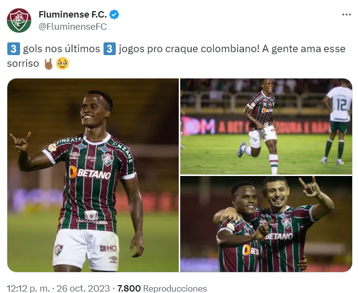Se habla mucho del concierto de errores de Fluminense partido a partido, lo que deja en claro que está en la final de la CONMEBOL Libertadores por lo bien que ataca. Germán Cano es la principal carta de ataque del conjunto brasilero, pero quien se viene poniendo el traje de goleador últimamente es otro: Jhon Arias.