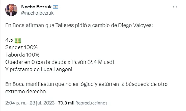 Acorde a lo que informa el periodista Nacho Bezruk, por Valoyes, Talleres le pidió al Xeneize, 4,5 millones de dólares, el 100% de los pases de Agustín Sandez y Vicente Taborda, quedar en 0 con la deuda de Pavón, que es de 2,4 millones de dólares y el préstamo de Luca Langoni. Además, agrega que en Boca manifiestan que no es lógico y están en la búsqueda de otro extremo derecho.