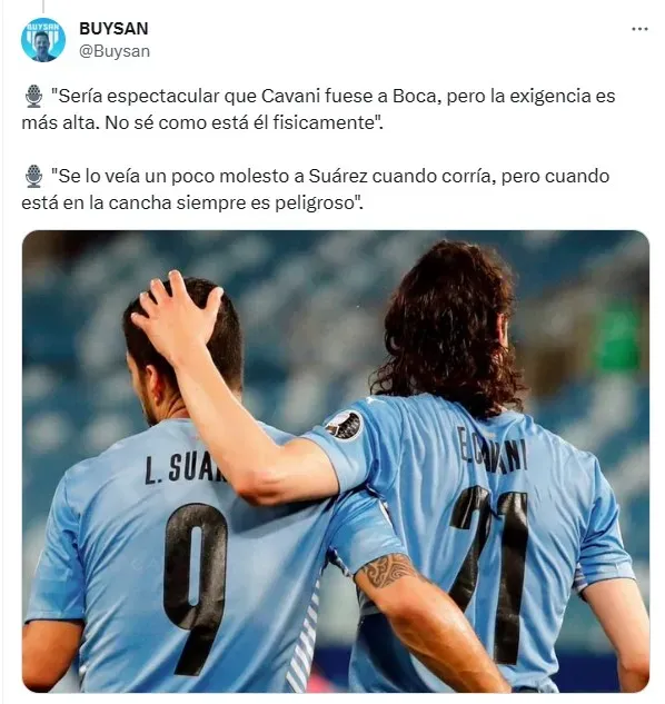 Sobre las lesiones que aquejaron al Matador durante la última temporada con Valencia, Forlán mostró su desconocimiento: “No sé cómo está él físicamente”. De todas formas, la ilusión desde Uruguay está latente e incluso Cavani podría jugar en su tierra natal si se dan los tiempos, ya que Boca enfrentará a Nacional en los octavos de final de la CONMEBOL Libertadores 2023. Horas de definición.