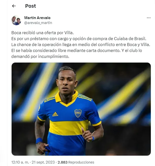 Mientras el delantero se encuentra en Argentina, el Cuiabá de Brasil le hizo una propuesta formal al club de la Ribera. Según informó Martín Arévalo, “Es un préstamo con cargo y opción de compra. La chance de la operación llega en medio del conflicto entre Boca y Villa“.