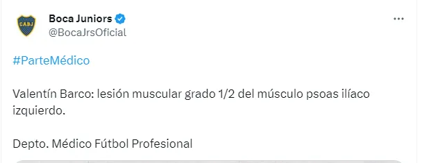 Luego de realizar los estudios correspondientes para determinar el grado de la lesión, en sus redes sociales la cuenta oficial de Boca publicó el parte médico del futbolista, que determina que sufrió una lesión muscular grado 1/2 del músculo psoas ilíaco izquierdo.