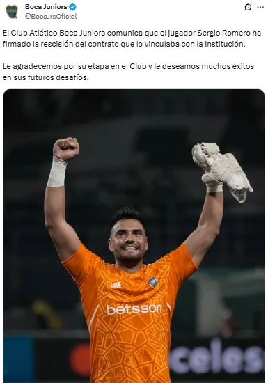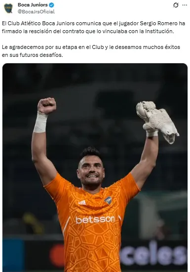 A través de sus redes sociales, el Xeneize informó la partida del 1: “El Club Atlético Boca Juniors comunica que el jugador Sergio Romero ha firmado la rescisión del contrato que lo vinculaba con la Institución. Le agradecemos por su etapa en el Club y le deseamos muchos éxitos en sus futuros desafíos.“.