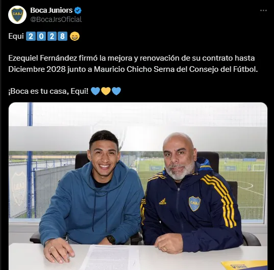 Mediante una foto suya con Chicho Serna en las oficinas del predio ubicado en Ezeiza, Boca posteó: “Equi 2028. Ezequiel Fernández firmó la mejora y renovación de su contrato hasta Diciembre 2028 junto a Mauricio Chicho Serna del Consejo del Fútbol. ¡Boca es tu casa, Equi!“.