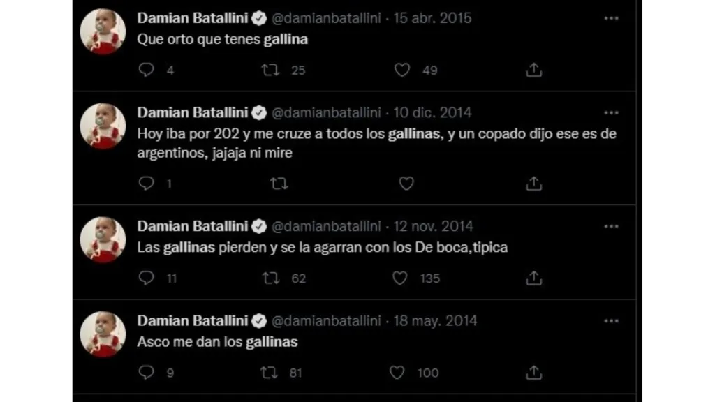 Con Batallini hay una historia peculiar, ya que si bien se lo disputaron entre Boca y River, en el ambiente millonario no cayeron bien algunos testimonios suyos en su cuenta de Twitter contra el club de Núñez debido a su fanatismo por el Xeneize. Allá por el 2015, cuando apenas había debutado en Argentinos, Batallini había escrito varios tuits contra River con frases fuertes como “las gallinas pierden y se la agarran con los de Boca, típica” o “asco me dan los gallinas”. Así mismo, en ese entonces chicaneó con el descenso ocurrido en 2011 llamando al equipo con b larga.