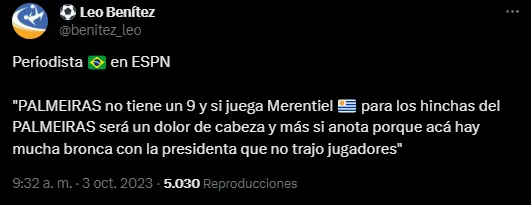 Al margen de la posible ley del ex por su pasado por Palmeiras, desde Brasil argumentaron en ESPN que la presencia de Merentiel en el XI de Boca sería “un dolor de cabeza” debido a que hay malestar entre los hinchas del club de Sao Paulo por no contar con un centrodelantero titular en su plantel por decisión del entrenador Abel Ferreira y de la Presidenta de la institución, Leila Pereira.