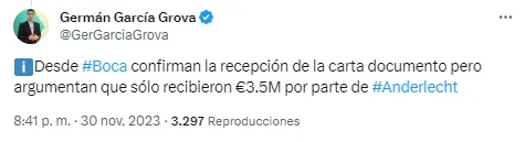 Según informó el periodista Germán García Grova, en Boca advirtieron sobre la llegada de la carta documento pero indicaron que el club belga solo giró alrededor de 3.5 millones de euros, la mitad de lo acordado. Cruce de versiones.