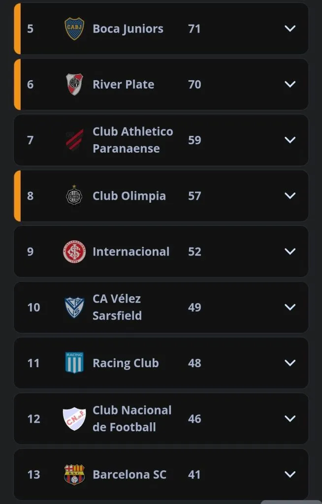 River, quien se perfila para quedarse con uno de los dos cupos de la tabla de la Conmebol para el Mundial de Clubes, también sumó 6 puntos esta semana con su comienzo en la Copa Libertadores 2024 (3 puntos por su participación en la fase de grupos y otros 3 por el triunfo 2 a 0 sobre Deportivo Táchira).