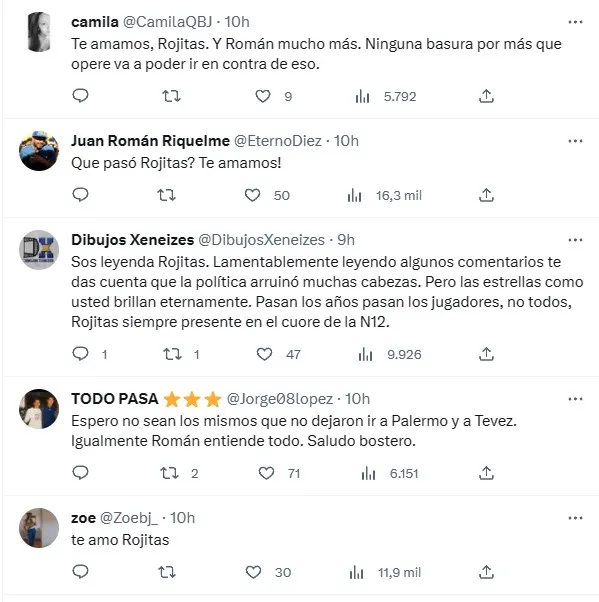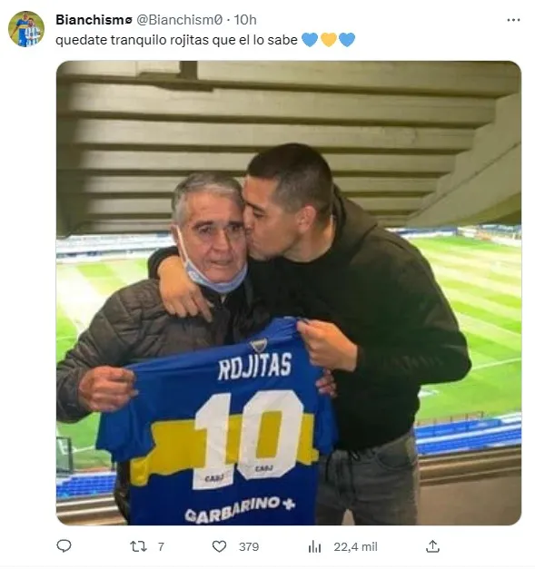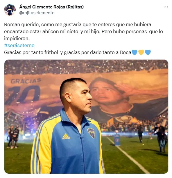 “Román querido, cómo me gustaría que te enteres que me hubiera encantado estar ahí con mi nieto y mi hijo. Pero hubo personas que lo impidieron”, escribió la gloria azul y oro con mucho dolor. Por último, Rojitas le agradeció a Riquelme por todo lo que hizo en el club: “Serás eterno. Gracias por tanto fútbol y gracias por darle tanto a Boca”. Los mensajes a Rojas cayeron como la lluvia, intentando darle tranquilidad. Incluso se habla de cuestiones políticas, ajenas al fútbol. En fin, un triste comunicado.