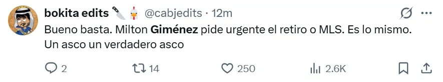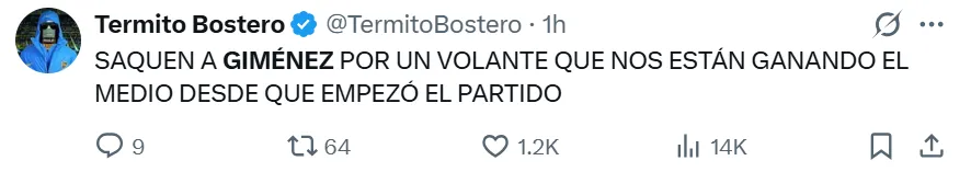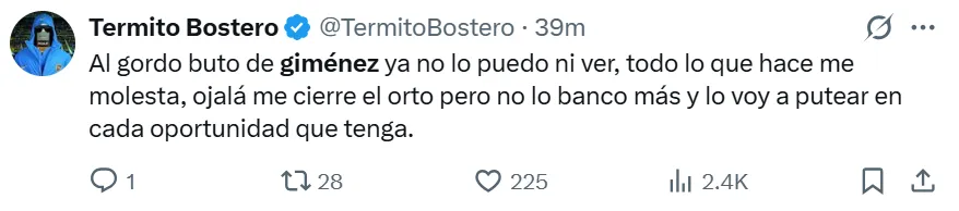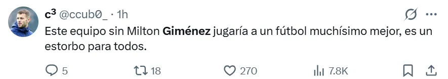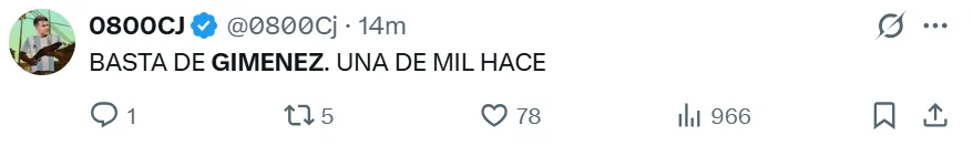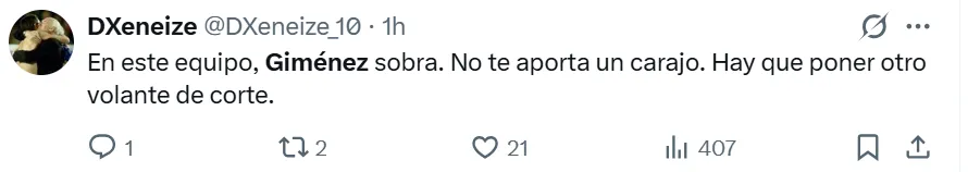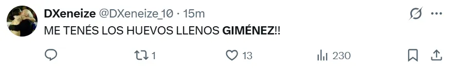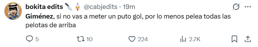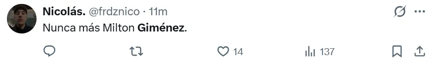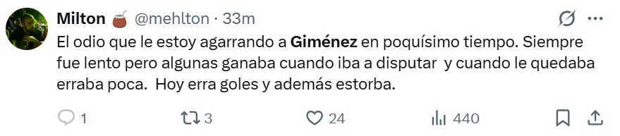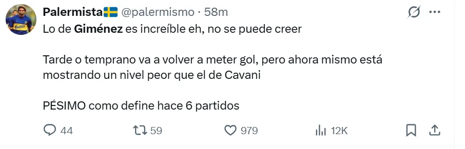 La falta de gol y la poca claridad en las jugadas decisivas se convirtieron en el mayor rival para Giménez en los últimos encuentros, entre los cuales falló oportunidades claras en duelos recientes de alta exigencia, como los enfrentamientos ante River y Talleres. Bajo este contexto, los hinchas de Boca no se mostraron conformes con su rendimiento en redes sociales y lo reprobaron con extrema dureza.