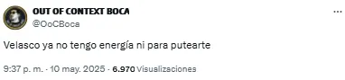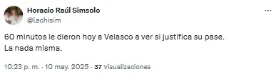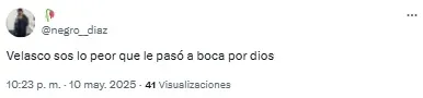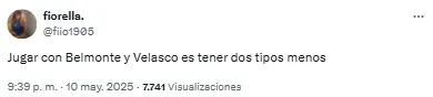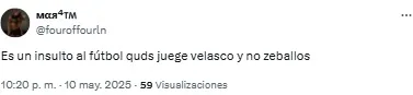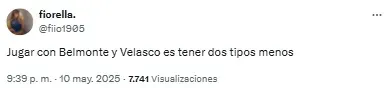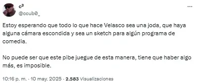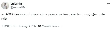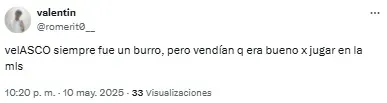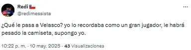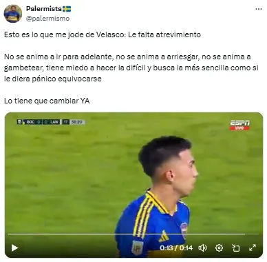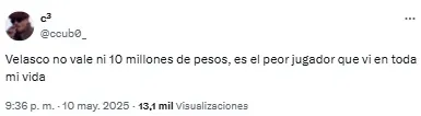 Pero las fuertes críticas se extendieron también a las redes sociales, dónde cientos de hinchas se manifestaron en contra de su rendimiento. “Es un insulto al fútbol que juegue Velasco”, disparó uno de los usuarios, mientras que otro soltó: “Lo recordaba como un gran jugador, le habrá pesado la camiseta”.