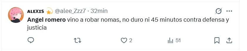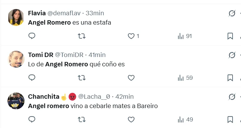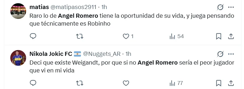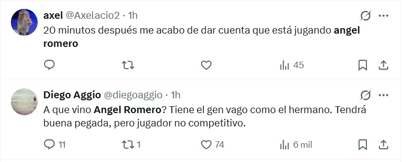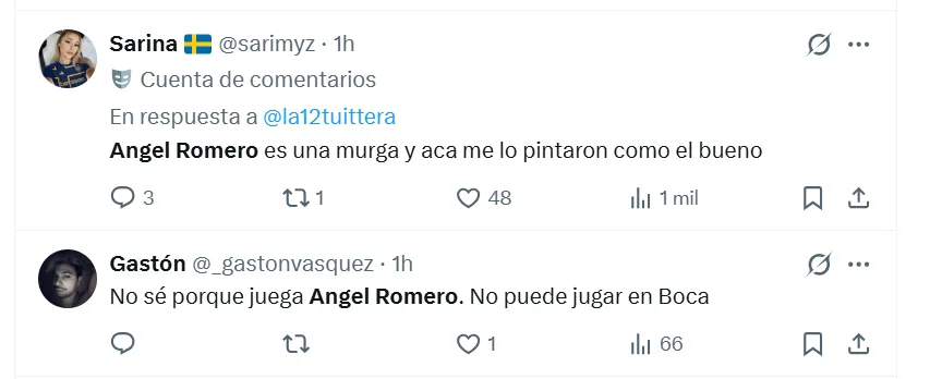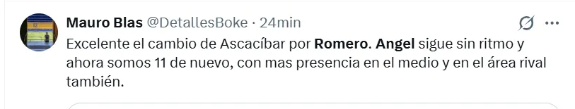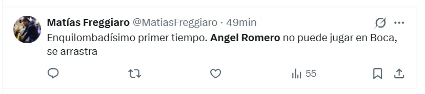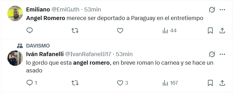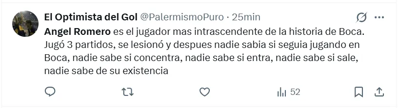 Lo cierto es que, pese a la goleada por 3-0, los hinchas de Boca arremetieron contra Ángel Romero. En un equipo lleno de habituales suplentes, el paraguayo empezó de titular pero fue reemplazado en el entretiempo por su prácticamente nula participación en los ataques. En ese sentido, uno de los fanáticos se expresó en su cuenta de X (ex Twitter) y manifestó: “Tremendo pecho frío“.